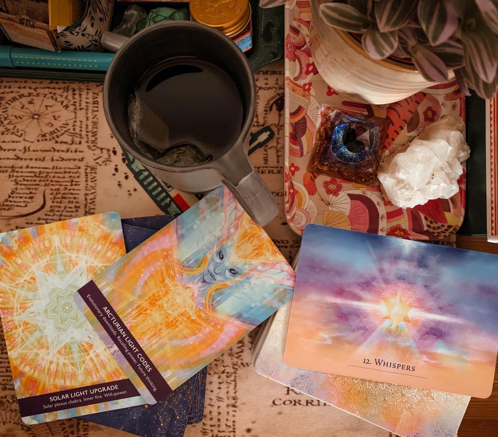 I will pull from two decks: one deck I always return to, without fail – it is The Secret Language of the Light. The other is a more recent deck that I love for the imagery and focus, but the author does not resonate with me: Gateway of Light Activation. I am being told now that my disconnect with him is connected to his “misteachings” in a past life where I observed him (at a distance but not intimately) and that I need to release that and “offer him another chance to redeem himself” in this lifetime (but I have seen him transition through periods of ego which is why I feel disconnect in this lifetime in the first place). I’m hearing I need to offer grace. I’m only human; I’ll do my best to work at it!